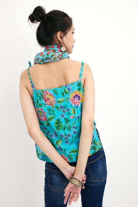 Blue handwoven camisole featuring hand-painted chintz prints in handwoven silk cotton base, embellished with French knots and sequins & beaded tassels with shoulder tie-ups.