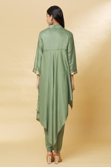 Buy_Aakaar_Green Cotton Silk Sequin Spread Collar Tunic And Draped Pant Set_at_Aza_Fashions