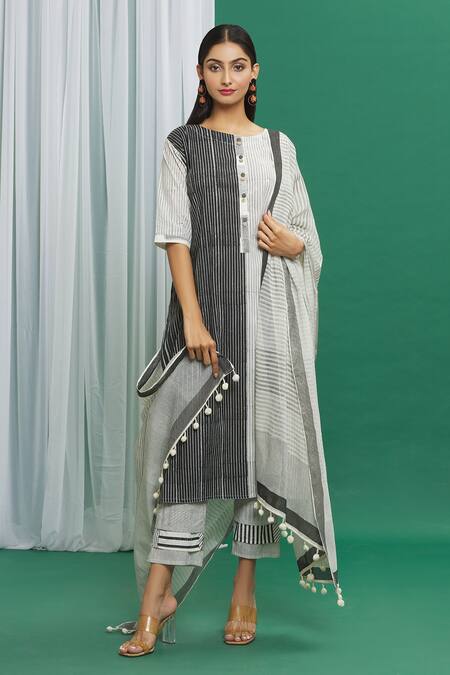 White, black cotton dupatta with stripe print & tassel border.