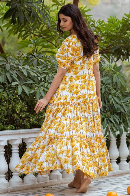 Yellow tiered dress in with sunflower hand block printed motifs & puffed sleeves.