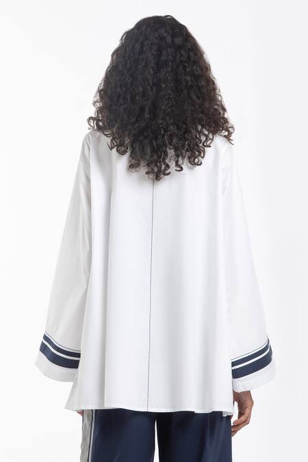 White top with round neckline, wide sleeves with applique work. Comes with narrow fit pant.