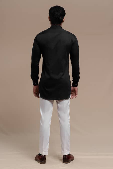 Black kurta style shirt. Enhanced with smocking details on the front.