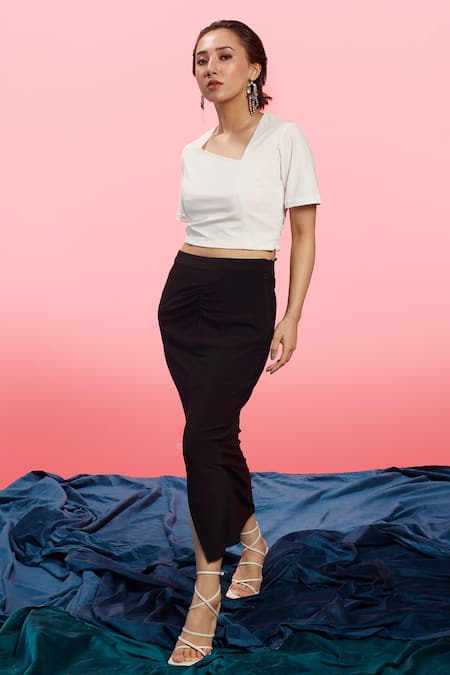 Ivory crop top with asymmetric neckline. Paired with black high waisted pleated skirt.