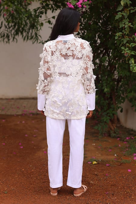 Ivory sheer overlay shirt featuring floral applique details and long sleeves. Paired with a solid bustier and straight trousers for a coordinated look.