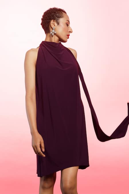 Aubergine sleeveless dress with cowl neckline & drape detailing.