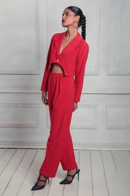 Red punto crop blazer featuring embellished buttons and a lapel collar. Paired with matching pants, both designed with a woven pattern and full sleeves.