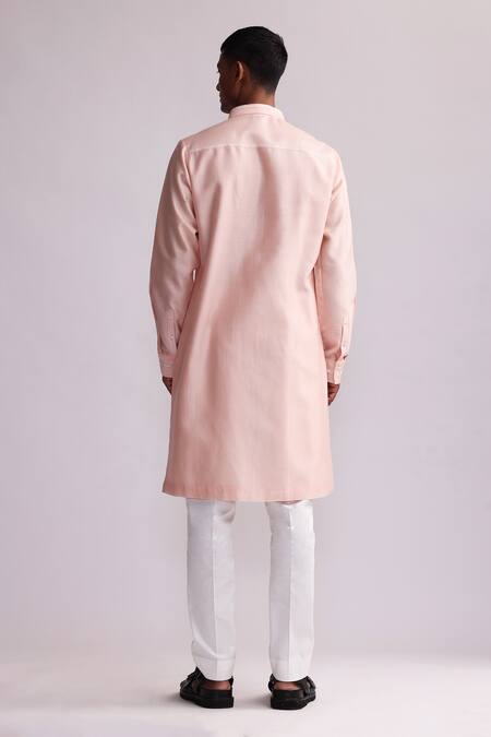 Old rose kurta featuring thread embroidered lines and a band collar. Paired with matching pants for a complete set.
