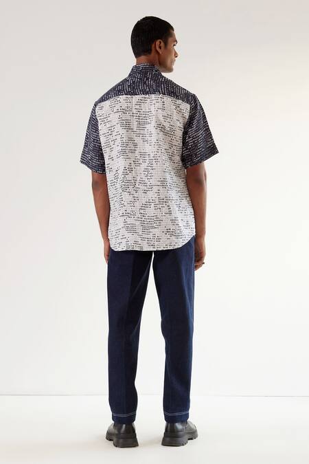 Navy blue & white camo-block patch printed shirt in fabric base, patch pocket square & collar.
