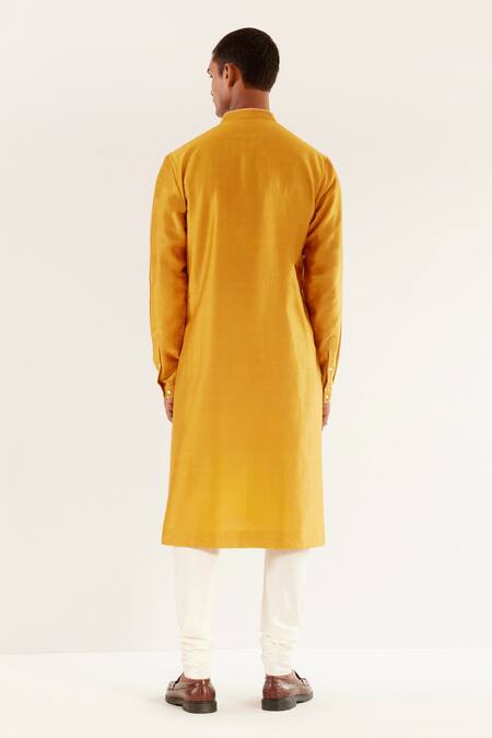 Mustard yellow chanderi kurta with v-notch embroidery and mandarin collar. Comes with churidar.
