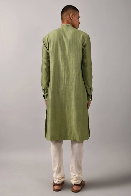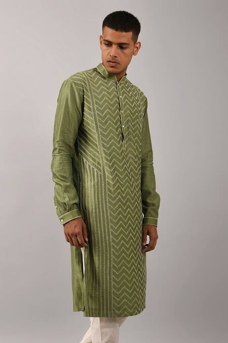 Sage green straight kurta with all-over thread work in chevron pattern. Comes with ivory cotton churidar.