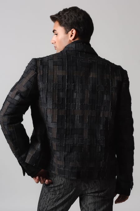 Black Silk, Cotton, Linen Coma Checkered Pattern Jacket