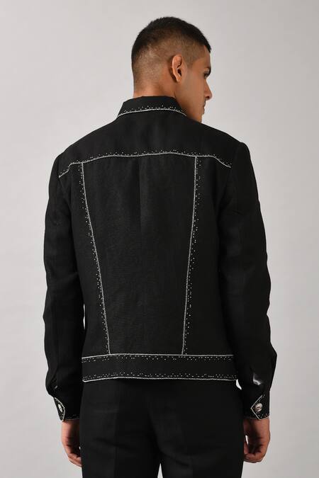 Black jacket with embroidered motifs and exaggerated front pockets.