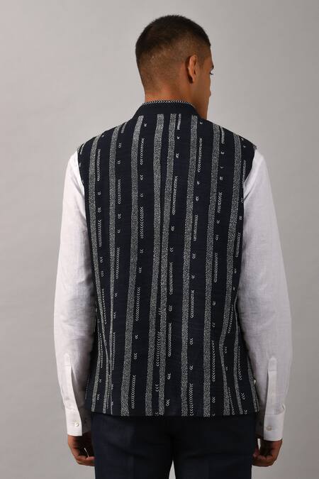 Black bundi with all-over thread work in striped pattern & front button closure.