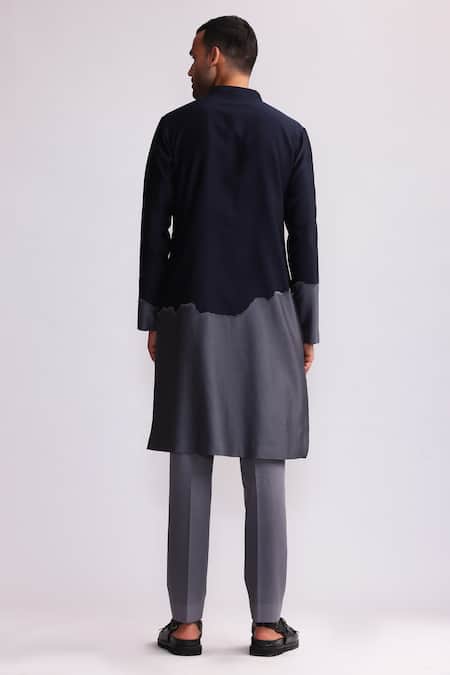 Blue chanderi kurta featuring tonal patchwork patterns with a mandarin collar. Paired with matching pants for a complete look.