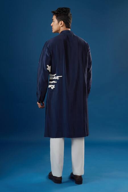 Navy blue kurta featuring abstract cloud shapes with embroidery. Paired with matching pants.