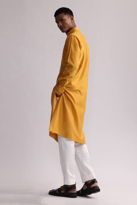 Mustard kurta featuring thread placement hand embroidery and a mandarin collar. Paired with matching pants for a complete look.