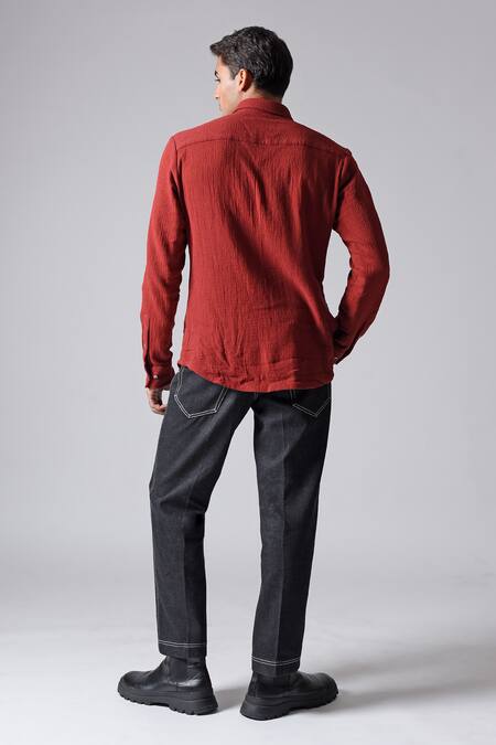 Brown crinkle textured shirt featuring a collar neckline and front button closure