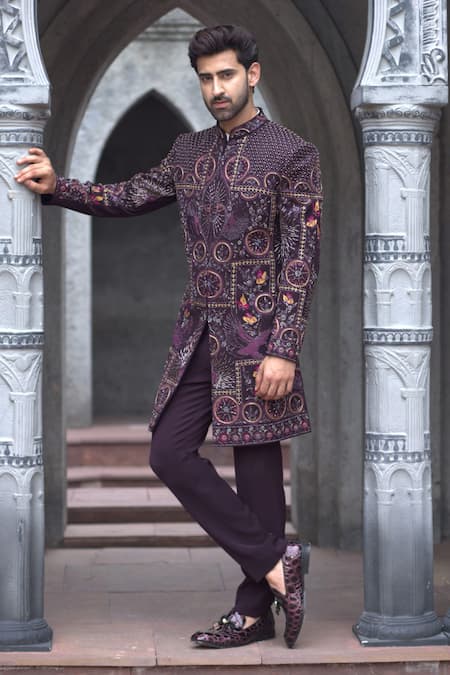Purple sherwani featuring full sleeves, band collar, and all-over Arabian dream embroidery. Paired with a matching trouser for a complete look.