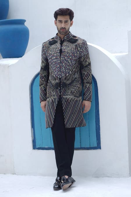 Black sherwani featuring full sleeves, band collar, and all-over Astron embroidery. Paired with a matching trouser for a complete look.