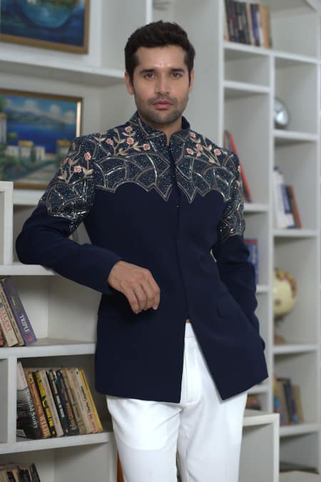 Black bandhgala featuring bloom garden embroidery on the shoulder yoke. Paired with a white trouser for a complete look.