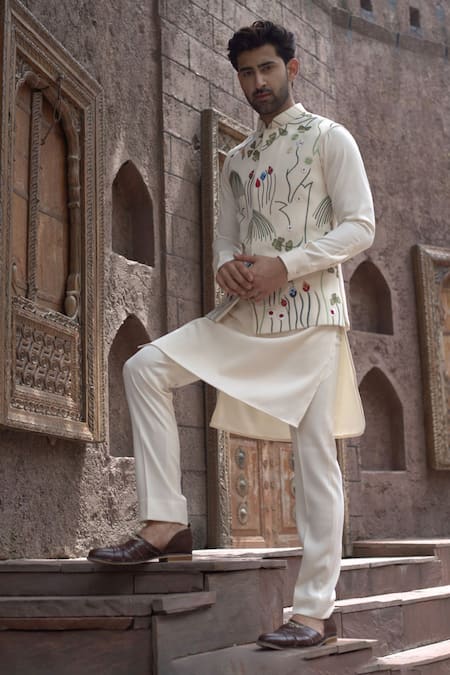 Ivory Silk Embroidery Gardenia Bundi Kurta Set