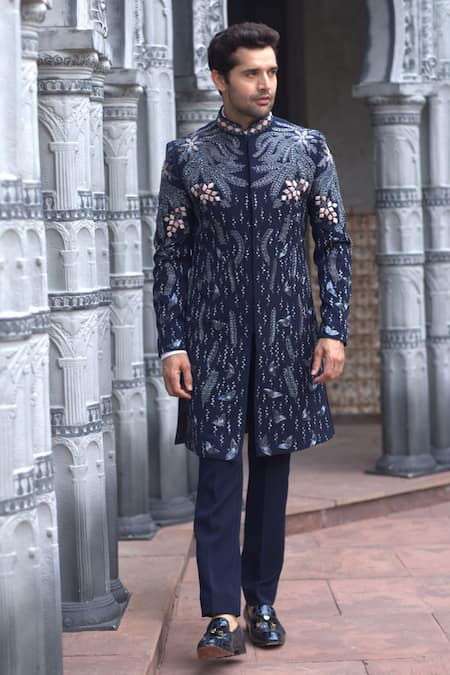 Black sherwani featuring full sleeves and band collar with all-over Midnight Jungle embroidery. Paired with a matching trouser for a complete look.