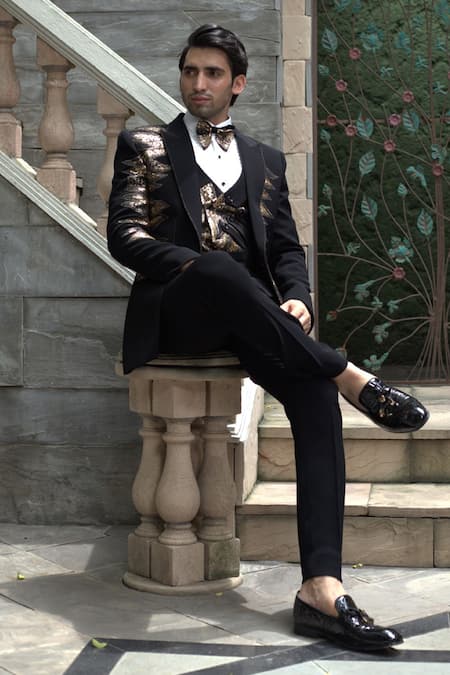 Sequin embellished abstract patterns on tuxedo, Lapel collar design on tuxedo, Full sleeves with tuxedo style