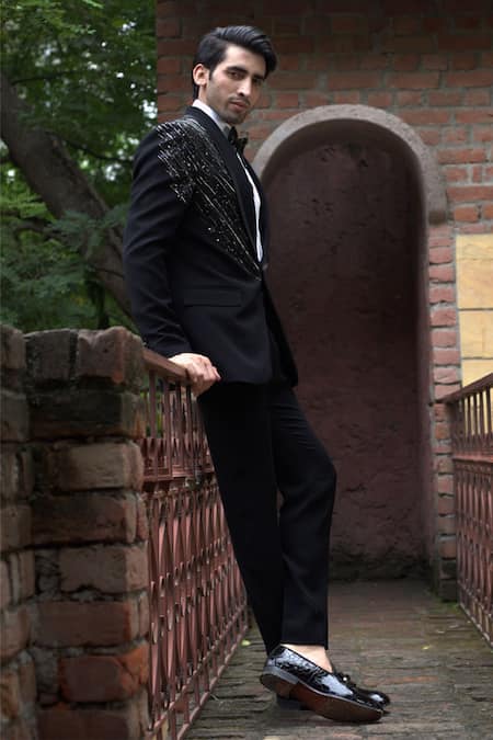 Black tuxedo featuring sequin and bead embellished clustered gradient patterns. Paired with a shirt, bowtie, and trouser.