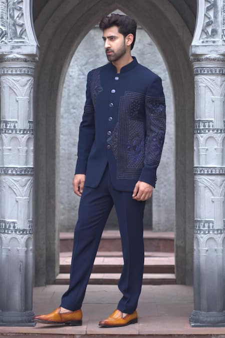 Blue bandhgala featuring full sleeves and Shamiyana bahar embroidery. Paired with a matching trouser for a complete look.