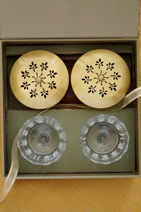 Handmade, Fragile: Yes, Dimensions L x W x H (in inches):, Bowl: 3.5 (dia)x 3, Brass Bowl: 4 (dia)x 2.5, Tray: 8.25 x 4 x 0.5, Product Weight (in kg):, Glass bowl: 0.170, Tlight: 0.130, Tray: 0.620, Note: The other two icecream bowls shown in the image are not for sale, Disclaimer: This product is handmade and each piece is unique! Due to the differences in displays of computers/laptops/phones, the colours on your screen may vary marginally from the actual colours of the product. The product is handcrafted and you will be able to see the human intervention of processing, which makes the products even more unique. There will be varations and undulations in finishings and workmanship.