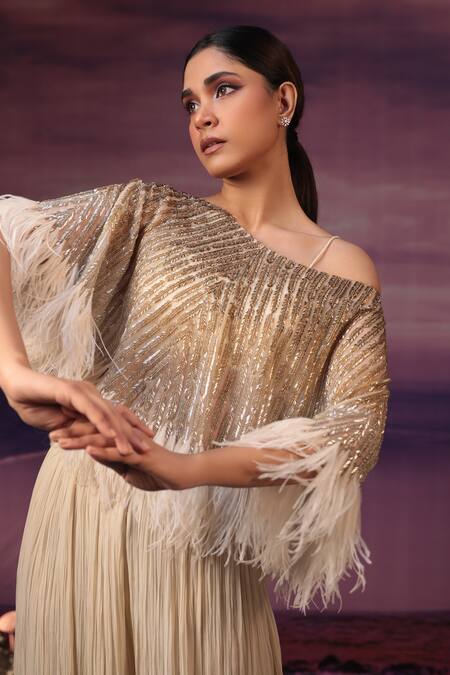 Ivory cape featuring geometric cutdana embroidery and faux feather hem. Paired with a pleated flared pant and a bustier.