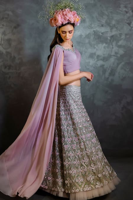 Purple lehenga with all-over heavy floral embroidery and frill detailing at the hem. Comes with draped blouse.