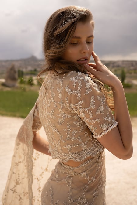 Beige organza saree featuring all-over floral hand embroidery with beads, sequins, and cutdana work. Paired with a blouse adorned with similar floral hand embroidery and a round neckline.