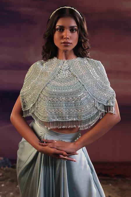 Powder blue cape featuring geometric patterns, sequins & cutdana embroidery. Paired with a cowl draped solid skirt and a bustier.