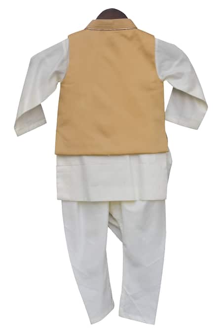 Off white cowl drape kurta featuring a mandarin neckline and full sleeves. Paired with a beige floral artwork nehru jacket and off white pants.
