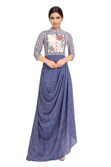 This ethnic themed maxi dress features a cowl drape layer at the base and a fitted bodice that is accentuated by floral motifs at the yoke. No of components: 1 Front loop buttons Mandarin collar Three quarter sleeves