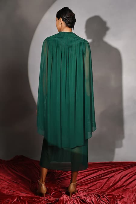 Green midi dress featuring a cowl drape with asymmetrical hem and pleated neckline