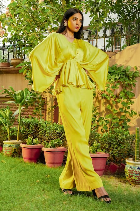 Lime yellow satin peplum top featuring a pleated yoke, cowl sleeves, and a V neck. Paired with wide-legged trousers that include side pockets and pleated details.