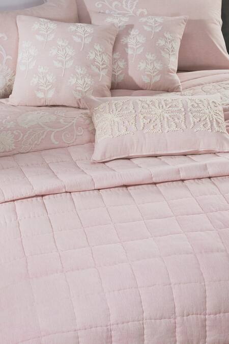 Pink bedspread in quilted pattern & floral, cradle embroidery. Comes with pair of pillow cover, pair of cushion cover & deck cover.