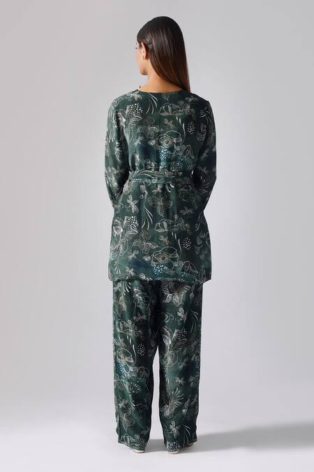 Green Crepe Printed Floral Jacket Open Pant Set