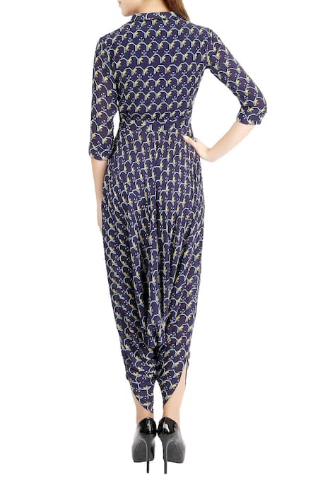 Navy blue dhoti-style jumpsuit with all-over geometric printed motifs.