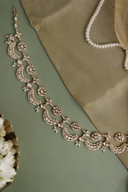 Gold crescent moon drop sheeshphool featuring kundan embellishments and pearl highlights