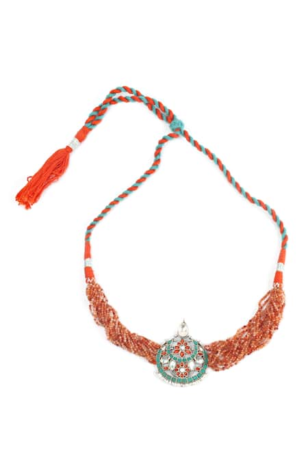 Crescent moon pendant with intricate stone embellishments., Multi beaded chain with a vibrant color mix., Pull-out drawcord for adjustable fit.