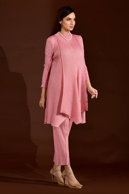 Pink A-line top featuring high neck, intricate pleated details on sleeves, and asymmetric hem. Paired with pleated straight fit pant.
