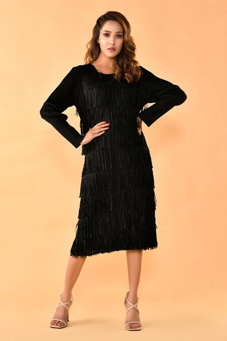 Black round neck full sleeve dress with fringe tassel embroidery.