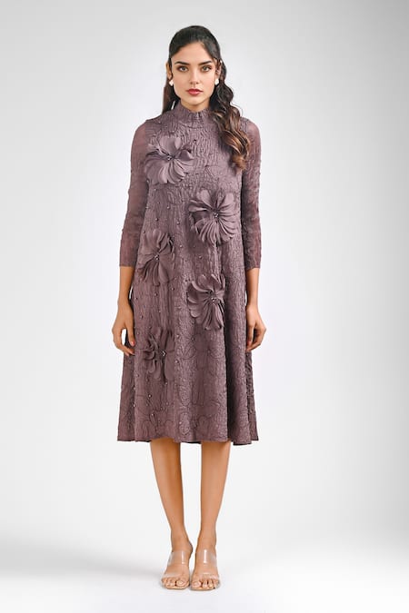 Brown midi dress featuring a textured base with floral applique pattern and pearl embellishments