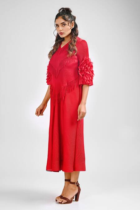 Maroon Polyester Ruffles V-neck Platina Textured Fringed Dress