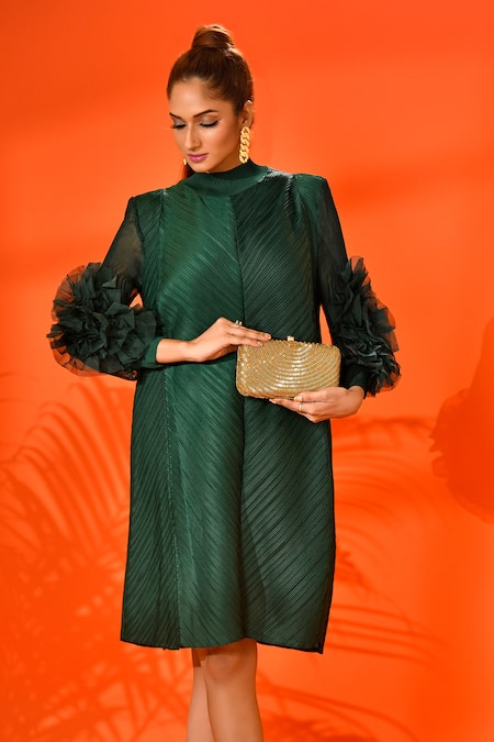 Buy_Crimp_Emerald Green Polyester Applique Round Neck Ruched Sleeve Dress_at_Aza_Fashions