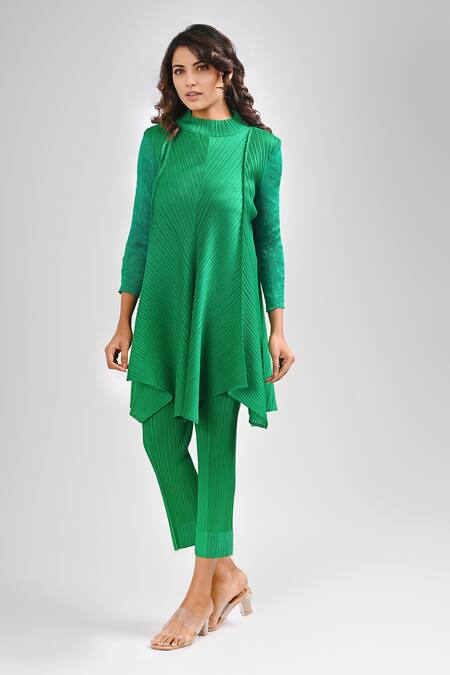 Emerald green tunic featuring a textured base and asymmetric hem. Paired with matching pants for a cohesive look.