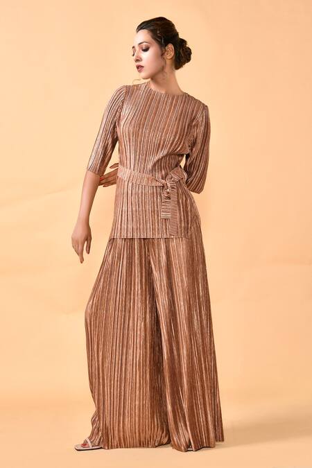 Buy_Crimp_Brown Polyester Round Neck Textured High Low Top With Pant_at_Aza_Fashions